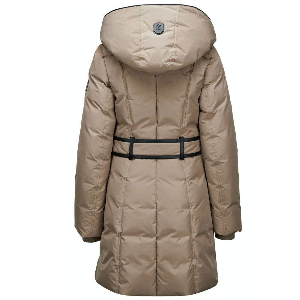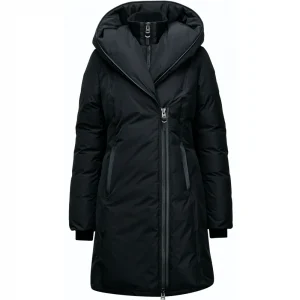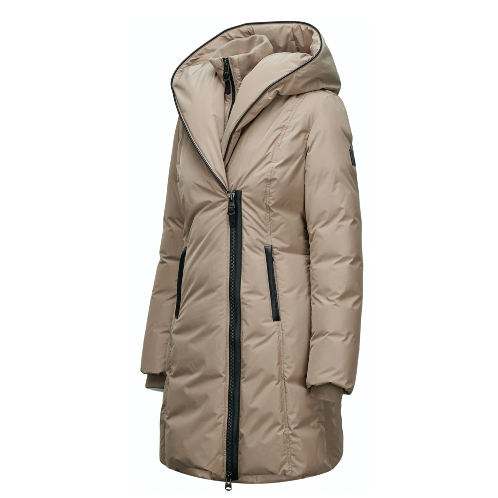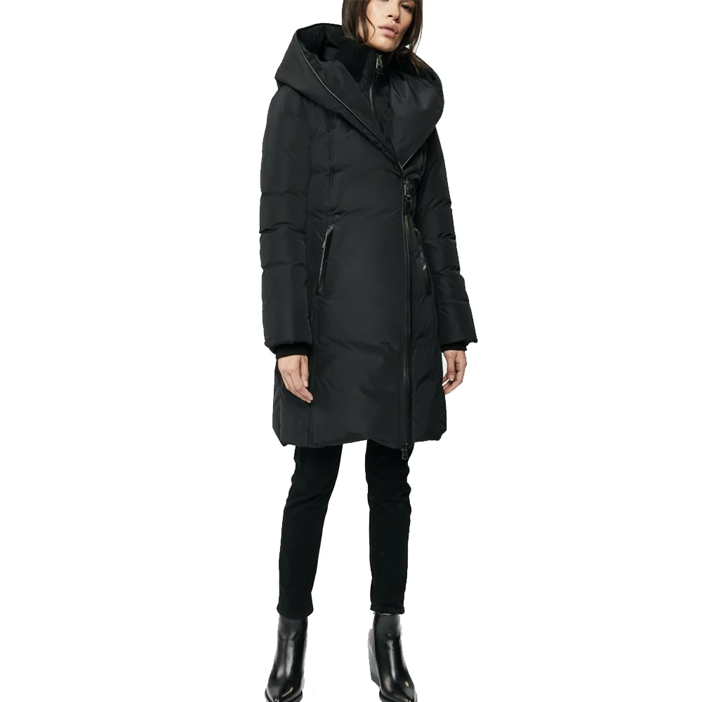 マットな質感の生地と女性らしさを引き立てる美しいシェイプラインは、着ぶくれせず品のある一着。大きめフードとアシンメトリーのデザインがとっても可愛い。