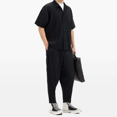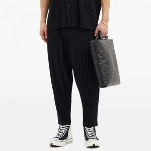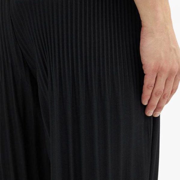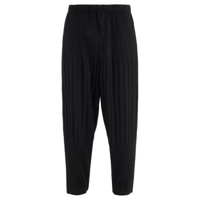 リラックス感漂う、Homme Plisse Issey Miyake(オムプリッセ・イッセイ・ミヤケ)のブラックパンツ。同ブランドのエクスペリメンタルなミニマリズムが反映された一本です。 ミッドウェイトのテクニカルジャージーを使用し、伸縮性のあるウエストと裾に配したプリーツでテーパードシルエットを生み出したデザイン。