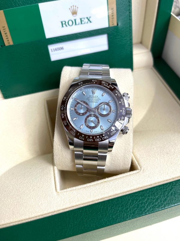 プラチナのオイスター パーペチュアル コスモグラフ デイトナは、アイスブルーダイアルとオイスターブレスレットを備え、チェスナットブラウン セラクロムタキメーターベゼルが特徴的である。