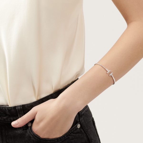 見事な輝きを放つダイヤモンドが、タイムレスなデザインを際立たせるブレスレット。マルチファセットのアイコニックなティファニー T コレクションは、目に見えずとも確かに感じることができる、大切な二人の絆を象徴しています。バラエティ豊かなティファニー Tのデザインと、このワイヤー ブレスレットを組み合わせることで、モダンと洗練を極めたルックを楽しめます。
