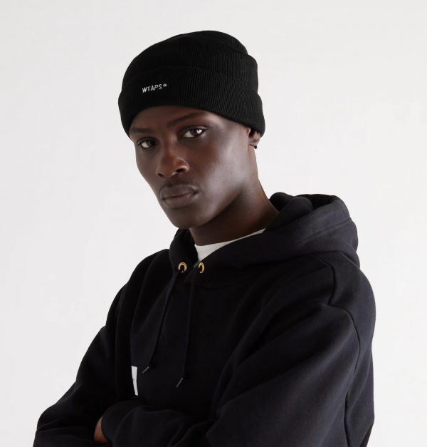 平編みのアクリルニットを使用したカフビーニー。ダブルで折り返したフロントにブランドロゴの刺繍。