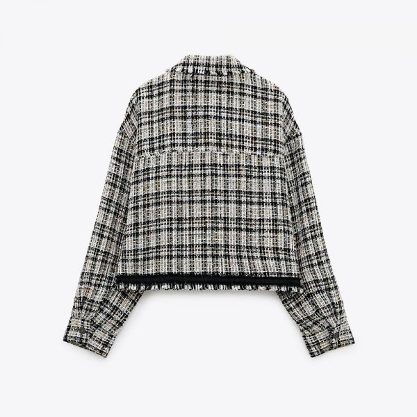 襟付き長袖ジャケット、フロントパッチポケット、コントラストデニム生地ディテール、フレイドトリム、フロントメタルボタン留め