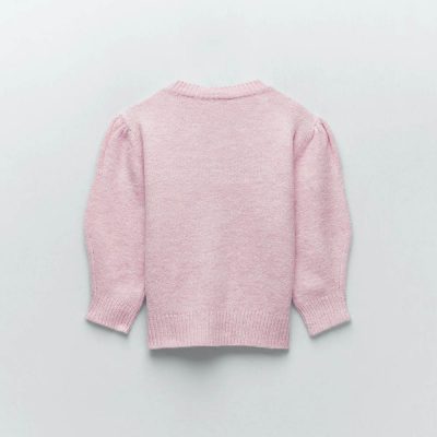 ニットカーディガン、ラウンドネック、肘下丈袖、スプリットヘム、リブトリム、フロントラインストーンボタン留め