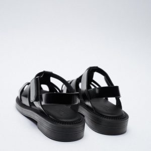 ブラックフラットサンダル、ケージアッパー、サイド面ファスナーストラップ留め